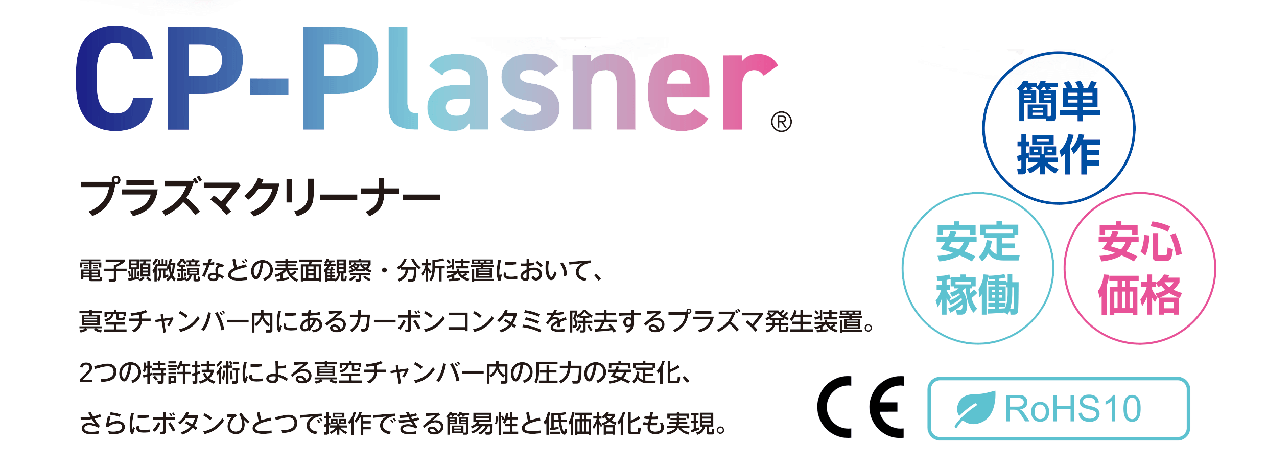 CP-Plasner®は13.56MHzの高周波を利用したプラズマ発生装置。主要分野は、電子顕微鏡などの表面観察・分析装置の真空容器内壁に付着した有機系コンタミネーションの除去です。